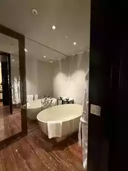 The hotel room features a wooden decor that creates a relaxing atmosphere 😎. There's a large bathtub that's incredibly comfortable for soaking—so much so that you might fall asleep while enjoying it. Plus, the room has excellent soundproofing!