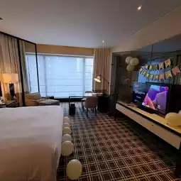 The room was decorated for my birthday, and they provided a cake and a fruit platter as a thoughtful gesture.