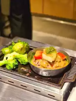 When served, it is placed in front of the iron plate, itself about 7 percent cooked, the clerk will also give a Japanese raw food grade egg with sukiyaki sauce 🍳 burger steak eat extremely Juicy, fat and lean moderate with a very fragrant beef flavor 😋 while also fried broccoli is all you can eat