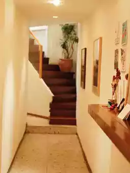 ✨ The simple decor, featuring wood tones and orange lighting, creates a cozy feel like hanging out at a friend's house.