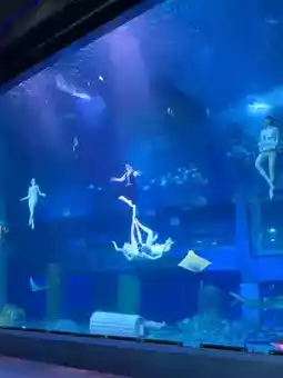 The aquarium has ten themed exhibition areas, live performances such as a mermaid show, and interactive exhibits