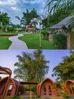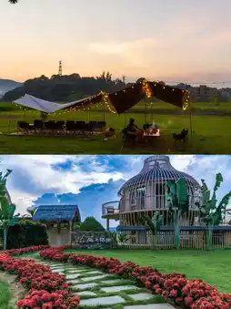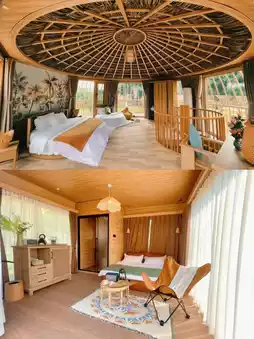 The resort is located in Huangpu District, Guangzhou, built along the mountains, backed by forest, and facing endless rice fields. Staying here, you can drive an off-road vehicle on bamboo forest paths, kayak on the lake, and choose from four types of rooms: Bamboo Forest Mountain Courtyard, Wandering Wilderness · Starry Sky Courtyard, 360° Terrace Panoramic Forest View, and Persimmon Red Wind Blowing Rice Field Courtyard. There is free parking available.