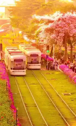Starting every October, Guangzhou enters the Bombax flower blooming season. You can take the tram slowly along the riverside, with a sea of Bombax flowers on one side and towering buildings on the other.
