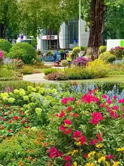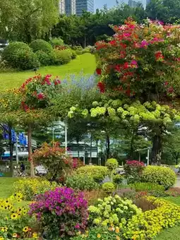 A 5-minute walk along the riverside trail leads here. The flower beds here have more layers, with petunias and cosmos spreading along the riverbank. Enjoy the river breeze while admiring the flowers, and you might even encounter pigeons taking a stroll, creating a full atmosphere.