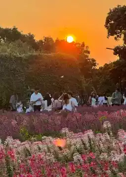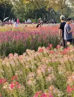 People are smiling, security is calling out, everyone remember not to step on the flower field~👮♂️