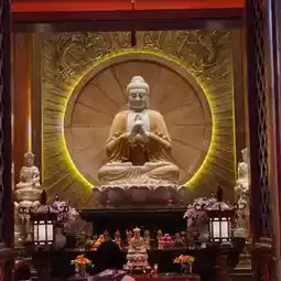 Three large sandalwood Buddha statues stand in the center of the temple.