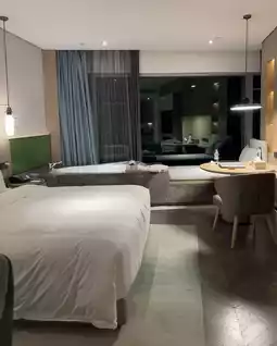 The 57th-floor cloud lobby is definitely the top photo spot, with 270° panoramic floor-to-ceiling windows capturing the bustling Panyu district in full view. The swing king bed room I stayed in offers great value, and the bird’s nest swing chair in the room is super photogenic. Snuggling in there to binge-watch shows at night is just amazing~ The modern light luxury design is full of details, with a red and black main color scheme paired with greenery that’s very stylish. Every snap looks like an Instagram-worthy shot.