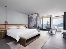 The hotel's location is unique, nestled close to the cliff, overlooking the Dishuitan Waterfall and the Baling River Bridge. From your room window, you'll be greeted by sweeping mountain views and cascading waterfalls, a true sense of the grandeur of nature. The Huangguoshu Waterfall scenic area is only a 15-minute drive away, making it easily accessible by car or charter, making it the perfect place for a relaxing getaway.
