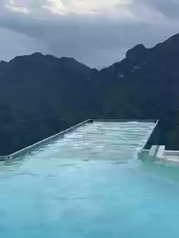 Standing by the infinity pool at Yaojia·Wangpu Guesthouse is simply breathtaking! Right across is the Tishuitan Waterfall cascading from the sky, as if you could reach out and touch it🌊✨ Floating in the pool, you look up to see the Baling River Bridge and the magnificent valley—every shot is a masterpiece📸