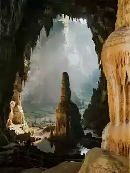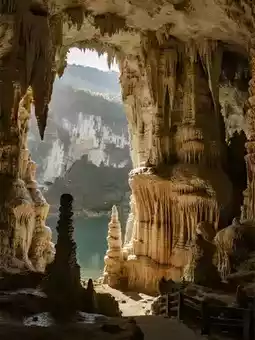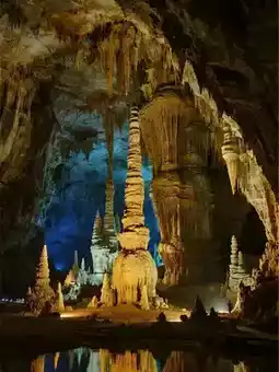 A stunning 17-meter-tall "white jade pine tree"! Pure white like ivory, shaped like a tower pine, looking like a delicate pagoda from afar. It’s also one of the "Three Treasures." It formed drop by drop, first growing into a tower shape, then a pine ball, and finally a flower shape, and it’s still growing. When showing kids, let them gently touch the nearby stone wall (remind them to be gentle) to feel the moist texture, and tell them, "This ‘tree’ grew slowly thanks to these water droplets."