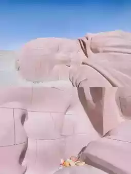 This giant sculpture of a sleeping baby lying on the Gobi Desert was created by Dong Shubing, a professor at the Sculpture Department of the Academy of Fine Arts at Tsinghua University. The sculpture is 15 meters long, 4.3 meters high and 9 meters wide. It is made of red sandstone and completed using 3D carving technology. It is carved and installed in blocks. It is like a child of Mother Earth, lying quietly in the embrace of the Gobi Desert, blending in with the surrounding environment, giving people a strong visual impact and spiritual shock.