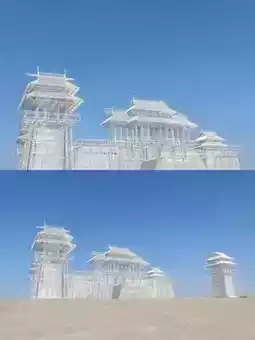 A pure white hollow Tang-style building, 60 meters long, 21 meters high and 40 meters wide. It is modeled on the architectural style of the Tang Dynasty sutra paintings in Cave 25 of the Yulin Grottoes, integrating traditional Chinese architectural style and built with modern building materials - about 6,300 specially customized scaffoldings connected by about 30,000 fasteners.