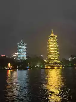 ✨Located on the banks of the Li River in downtown Guilin, the Sun and Moon Twin Pagodas are a renowned landmark in Guilin, renowned for their unique architectural style and spectacular night views, attracting numerous visitors.