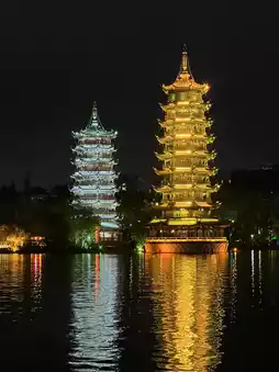 The Sun and Moon Pagodas stand prominently in the middle of Shanhu Lake. These twin pagodas are approximately 40 meters tall. The Sun Pagoda is made of brass and is the largest brass pagoda in the world, while the Moon Pagoda is made of silver-colored cement. Together, they create a beautiful and unique sight. Visitors can enjoy a leisurely stroll around the area, as the surroundings of the pagodas are a public park with a refreshing breeze from the lake. This spot is considered one of the most beautiful viewpoints in Guilin.