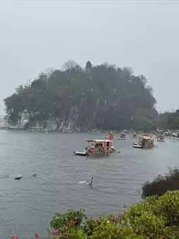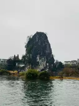 The beauty of Elephant Trunk Hill lies not only in its unique elephant-trunk-like shape, but also in its hazy beauty when shrouded in mist and rain. Bordering the Lijiang River, half resting on land and half submerged in the river, the mountain and water complement each other, forming the essence of Guilin's scenery. Between the "trunk" and "legs" of the elephant lies the Water Moon Cave, resembling a bright moon floating on the water, creating the famous "Elephant Trunk Hill Water Moon" scene. This view combines clear mountains, beautiful waters, wondrous caves, unique rocks, and stunning reflections.
