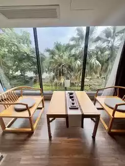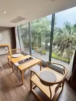The spacious and bright room welcomed me with bamboo leaves spelling out "welcome" on the bed—a heartwarming touch. The room features an oversized floor-to-ceiling window and a tea room, offering different moods whether it's sunny or rainy. Waking up to the stunning view in the morning, sipping a cup of tea, sets the tone for a wonderful day. The attention to detail is impeccable: high-end toiletries, a makeup magnifying mirror, a coffee machine, welcome fruits, and soft, skin-friendly bedding. Even the bathtub comes with thoughtfully provided bath salts.