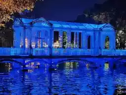 This ~500-character description: A glass bridge spans Banyan (Shan) Lake in Guilin, lit at night by vivid LEDs in blue, green, pink, and purple. The bright structure reflects in the lake, forming colorful patterns. Surrounding trees and pavilions are softly illuminated too. Visitors enjoy peaceful evenings crossing or walking nearby, soaking in the interplay of light and water, nature and design—resulting in a dreamy, magical ambiance