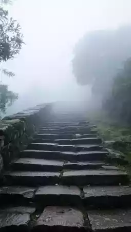 | Stone steps in morning mist | First-person perspective of "walking into an ink painting" |