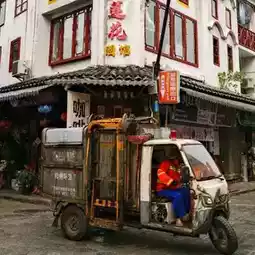 Yangshuo during the day is a whole vibe — fresh fruit stands bursting with citrus and passionfruit 🍋🥭, street vendors grilling snacks that smell way too tempting, and cobblestone streets winding between cafes, craft shops, and karst peaks that pop out from behind every corner.