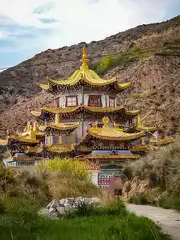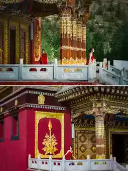 A Tibetan Nyingma sect temple, with solemn red, white, and gold Tibetan-style architecture. 📸 Take photos from the hill behind the temple of the "Padmasambhava statue + panoramic view of Longyang Lake," full of sacred vibes!