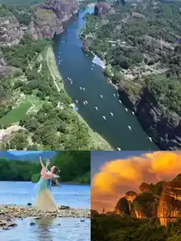 Bamboo raft drifting—"the boat sails on the blue waves, people travel in a painting." Ride Longhushan’s newly crafted forest-style bamboo rafts, drifting among the blue waves of Luxi River, gazing up close at Xianshui Rock, surrounded by Danxia cliffs and green wilderness. The misty water feels like stepping into an oriental landscape painting. Check-in spots: Spring and Autumn Warring States cliff tomb group, Yunjin Peak, Shigu Peak, Xiantao Rock, Yushu Rock, Danshao Rock, Xiangu Rock, Lotus Rock, Couple Peak.