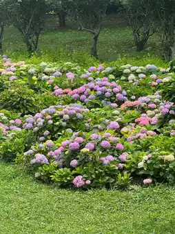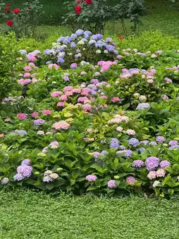 As you enter the park, large fields of hydrangeas come into view. They are colorful, including elegant light blue, pure snow-white, and delicate pink. Hydrangeas are closely embraced to form a huge flower ball, which looks particularly charming against the backdrop of green leaves.