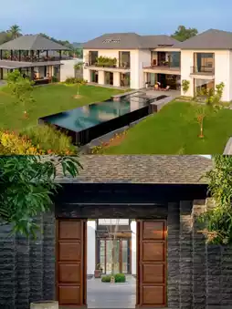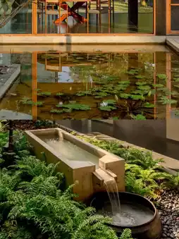 The house is never revealed all at once. The circulation is planned in such a way that the space slowly unfolds to the visitor throughout the experience and spatial journey of the house. From the small pavilion at the entrance to the spacious water courtyard at the entrance, the visitor's attention is focused on a calm and tranquil space centered around trees and the Nandi.