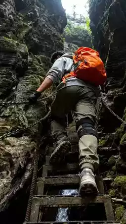 The most thrilling part is the iron chain plank road in the canyon, winding all the way up. Some parts are quite steep and require using both hands and feet to climb, which is super exciting! My 7-year-old kid climbed faster than anyone else, so it’s definitely great for family trips with kids.