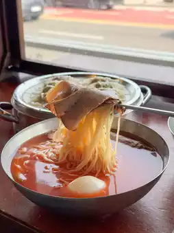 Mul-mil-myeon with a rich broth based on beef bones and chewy noodles,