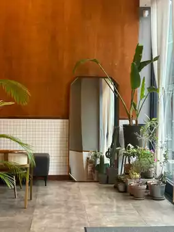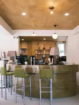 The interior features bright wooden furniture and an olive-green bar, creating a natural wood-tone atmosphere. Sunlight pours in, adding a warm and inviting touch to the space☀️