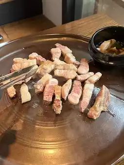 The samgyeopsal is thickly cut with a perfect balance of fat and lean meat, releasing a savory aroma as it grills🥢. The exterior is crispy while the inside remains juicy, bursting with flavor. The accompanying fresh lettuce wraps, sauces, and kimchi further enhance the taste of the meat. The subtle charcoal-grilled aroma adds to the overall satisfaction throughout the meal. It's a great dish to enjoy with rice or as a side for drinks.