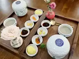 Coffee sets also come with refreshments, such as cookies, dried fruit, and yanggaeng (sweet red bean jelly).