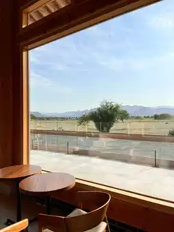 A cozy cafe with a modern and clean interior. Large windows allow natural light to flood in, creating a bright and comfortable ambiance.