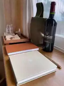 a bottle of water, a storybook(?), a guestbook, etc. It's ready
