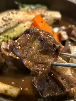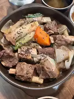 I ordered the stewed spareribs without spiciness. It was beef. The pot had soy sauce as the base but it wasn't too salty. I felt the meat was just average, but the meat was easy to separate and there wasn't too strong a beef flavor (almost none)? I think the rice cake in the pot is very chewy and delicious. The overall portion is just right for two people, not too full. The mixed vegetables are delicious. I was able to get several bowls of mixed vegetables to fill myself up🤭