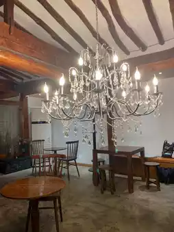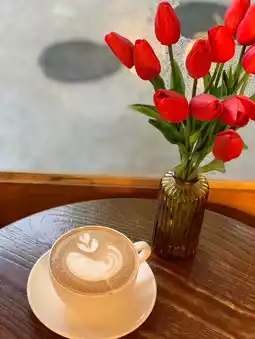 The interior of the cafe is a fusion of Korean tradition and modernity, decorated with chandeliers and beautiful flowers, creating a calm atmosphere