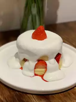 Fluffy soufflé pancakes with strawberries, strawberry syrup, sweet and sour sauce, and plenty of fresh cream are delicious!
