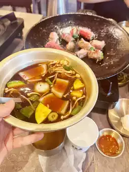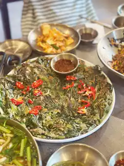 This restaurant specializes in Sonmali meat, where green onions and perilla leaves are wrapped in beef. For a group of four, we ordered two plates of Sonmali meat. The first plate was simply grilled and enjoyed, while the second plate was grilled and then paired with a pot-lid-style soybean paste stew poured over it. This two-way dining experience offers both great taste and a unique culinary experience.