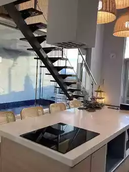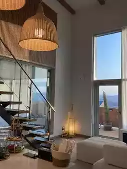 This is a duplex-style private pool villa with 2 bedrooms, a living room, and 3 bathrooms. It features 4 double beds, providing ample space for relaxation.