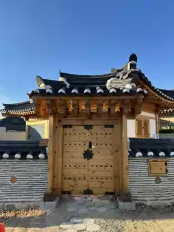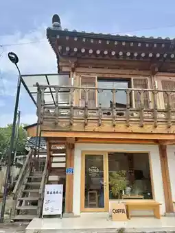and the duplex design allows you to enjoy the view of the hanok's tiled roof from the second floor, adding to the charm.
