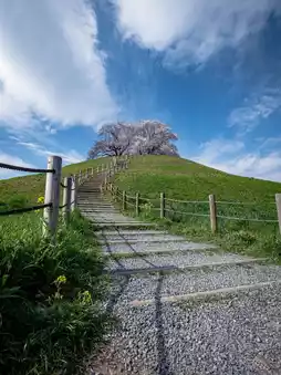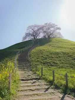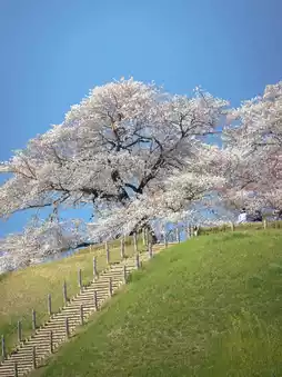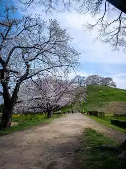 The author visited on a sunny spring day. The view from the top of Maruzukayama Kofun features a group of ancient tombs decorated with cherry blossoms and a blue sky, making you feel as if you have traveled back in time to ancient times.