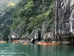 🛏️ Our cabin was surprisingly cozy — complete with a balcony and sweeping views of the jade-green waters. After a delicious seafood lunch, the real adventure began: kayaking through quiet coves, visiting hidden caves like Luon Cave, and swimming near Titop Island, where the water sparkled under the afternoon sun.