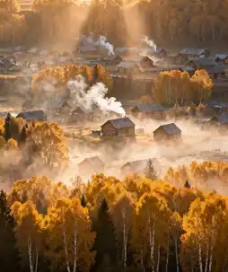 - Hemu Village is known as "God’s Reserved Land." In the early morning, cooking smoke rises from the Tuvan wooden houses and mingles with the morning mist, swirling above the golden birch forest like a fairy tale.