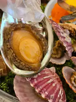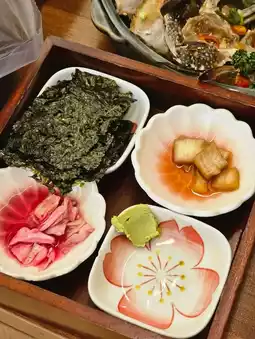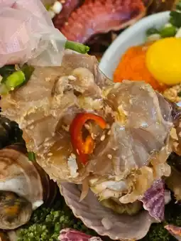 A plate full of raw pickled seafood platter is super amazing, with three raw crabs, ten raw pickled shrimps, two pieces of bacon, several shellfish and a cooked octopus.