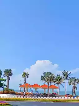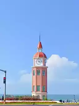 Blue skies, ocean, sandy beaches, boardwalks, and a clock tower—visit on a sunny day, and it feels like a Hayao Miyazaki fairy tale! The beach below is stunning, proving Haikou’s seaside charm.