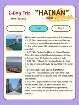 Hainan is a tropical paradise in the south of China, famous for its stunning beaches, lush landscapes, and the world’s largest Guanyin statue 🕊️🌊. Ready for a relaxing getaway? This easy 2-day itinerary from Beijing will help you explore Hainan and experience all the must-see spots—with plenty of sunshine and sea breeze! 🌞