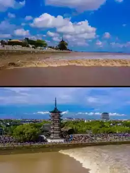 ✅ Tide Watching Park: ⭕️ The highlight ➡️ the best place to watch the Qiantang River tidal bore! The best times are from the 1st to 5th and 15th to 20th of the lunar month, when the tidal wave rushes in spectacularly. Check the “Qiantang River Tide” public account tide schedule in advance and wait under the Ao Tower for the “first-line tide.”