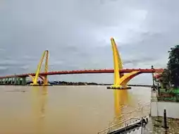 ✨️ Hoang Sa Bridge (Hoàng Gia Bridge) is a beautiful and unique structure, featuring red arches and yellow pillars, crossing from Haiphong to Vu Yen Island.
