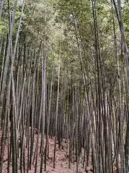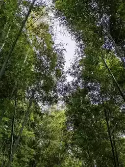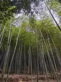 Stepping into this bamboo forest feels like entering a secluded green paradise. The tall bamboo shoots rise from the ground like guards dressed in green, standing tall and pointing to the sky. Sunlight filters through the dense bamboo leaves, casting mottled shadows like scattered gold foil, dancing and sparkling on the ground. A gentle breeze rustles the bamboo leaves, as if softly telling ancient stories or playing a melodious natural symphony.