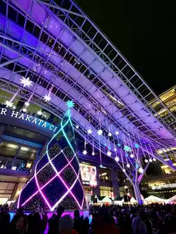 Winter evenings in Hakata are magical — the station area glows with dazzling illumination lights, drawing crowds of people enjoying the festive atmosphere. The Christmas Market adds even more warmth to the season, with the scent of mulled wine and cheerful music filling the air.